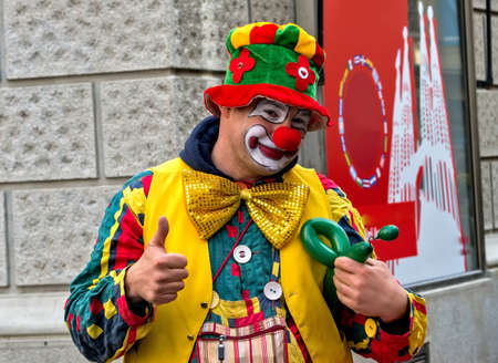 Belgrade, Serbia - February 27, 2016: Street clown in a busy pedestrian street in the heart of Belgrade entertains passers-by and children
