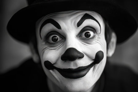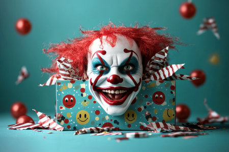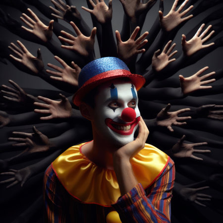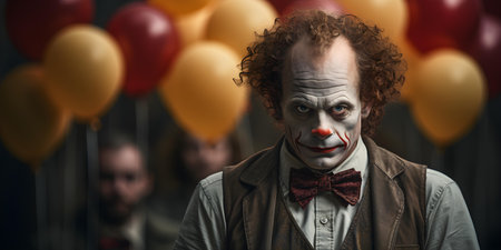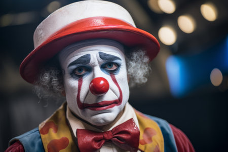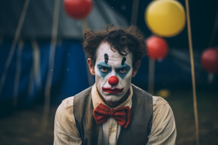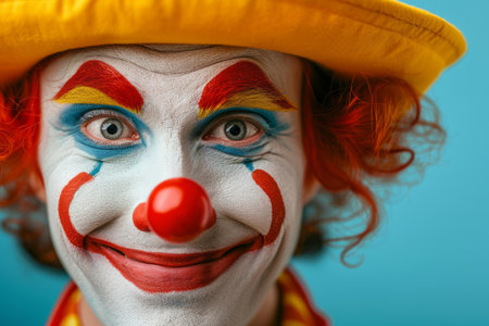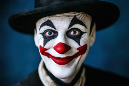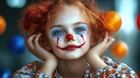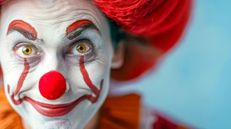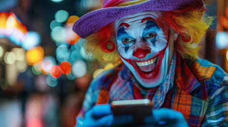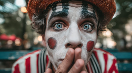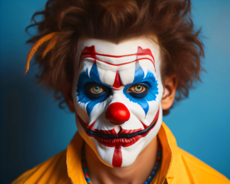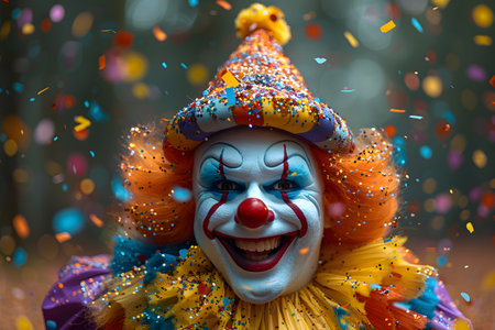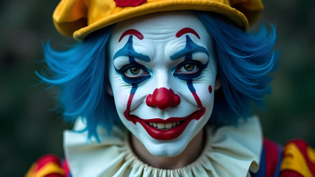 A clown with vibrant clown makeup and a colorful hat is depicted in this scene. The clowns face is adorned with exaggerated features and bright colors, symbolizing the traditional characteristics of a clown.
