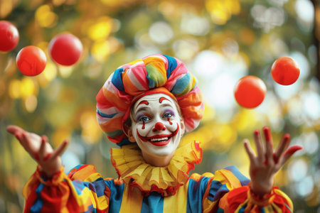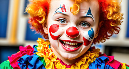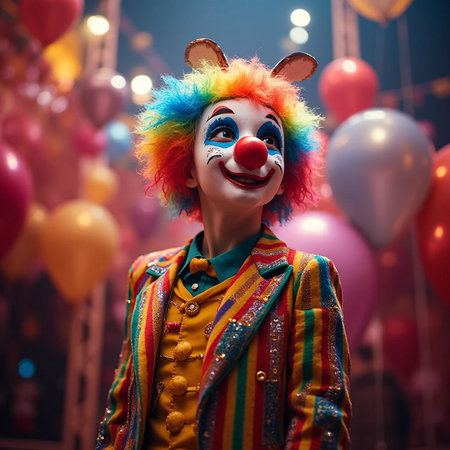 Joyful performer: cute children clown, young audiences with cheerful acts, balloon animals, playful tricks, happiness and excitement at parties and celebrations.
