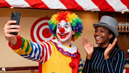A cheerful clown in a colorful rainbow wig and costume holds a smartphone to take a selfie with a smiling woman wearing a top hat at a funfair event.