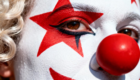 An extreme close up of a person in clown makeup. The face is painted white with a large red star around a brown eye and a classic red foam nose.