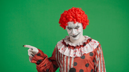 Scary halloween man clown with spooky makeup and wig dressed in costume smiles at camera pointing finger at side, isolated on chroma key green screen background.