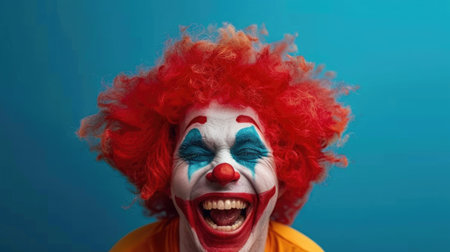 A clown with red hair and a white face expressing a loud laugh, set against a vivid blue background, depicting humor and fun. World Laughter Day. World Circus Day.