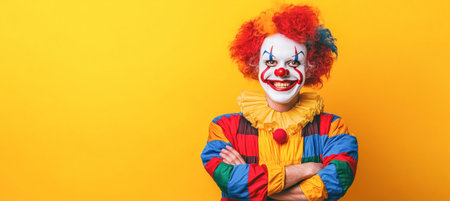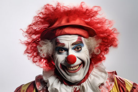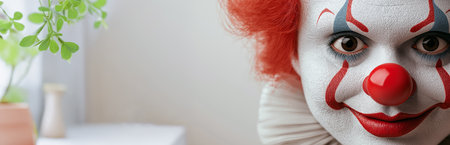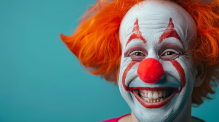 Happy clown with red wig and colorful makeup smiling. Copy space for text