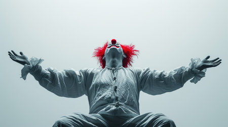 A creepy clown with red hair and white makeup stands eerily, sending shivers down the spine with its menacing presence.
