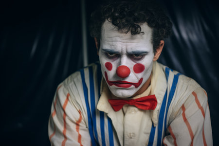 Sad clown exhausted circus jester joker emotions unhappy depressed performer. Carnival man sadness depression melancholic face expression make-up worried person costume dressed actor backstage circus