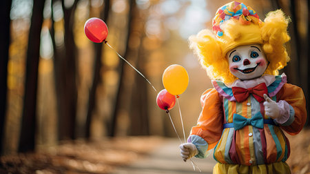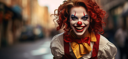 Intriguingly amusing clown woman adorned in vibrant atmosphere. An amusement source for both youngsters and grown-ups, this circus entertainer brings joy and laughter