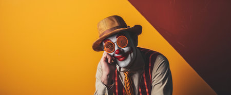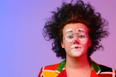 Closeup portrait of a clown man with bright makeup in a colored suit and glasses. April Fools Day concept. Birthday for kids