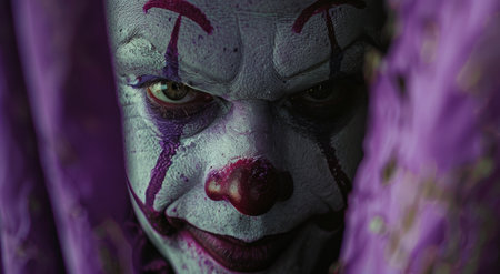 A clown with white face paint and red lipstick is peeking out from behind two purple curtains.