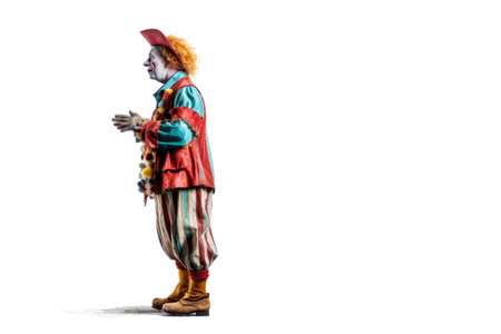 Side view full length picture of a clown imitating comic walk isolated on white background. Generative Ai