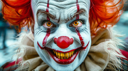Scary creepy smiling clown circus jester joker villain carnival murderer horror halloween adult man evil expression make-up bizarre dark actor spooky monster face sinister staring frightening close-up