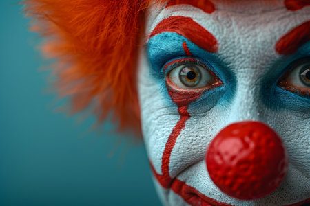 A detailed view of a persons face adorned with colorful and exaggerated clown makeup. The makeup includes exaggerated features like a red nose, painted smile, and oversized eyebrows. The persons eyes are accentuated with bold colors and patterns, adding to the whimsical and eccentric look.