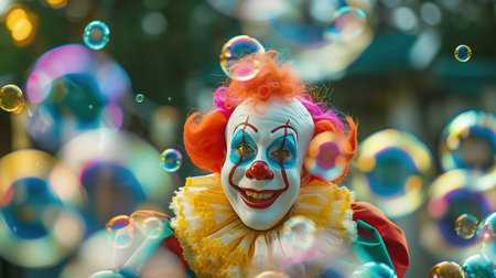 Clown blowing bubbles at outdoor festival for fun, fantasy and summer adventure in nature. Face of person, street performer or circus character in park with creative color at happy carnival event.