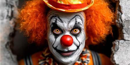 A Creepy Orange Haired Clown Breaks Through a Brick Wall, Eyes Ominously Glowing for Halloween Fun