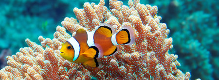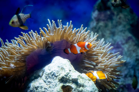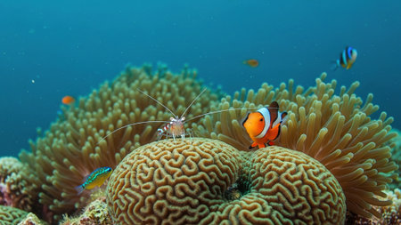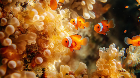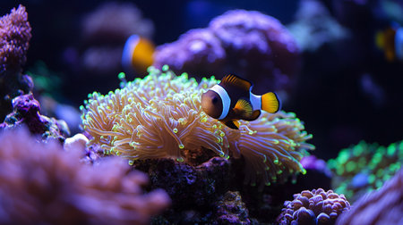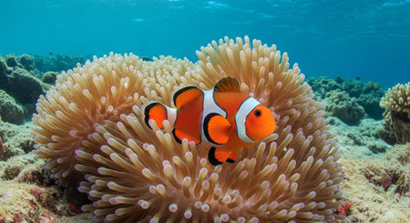 Clownfish swimming among sea anemone tentacles in a vibrant underwater scene