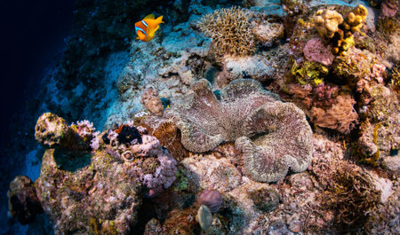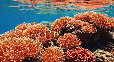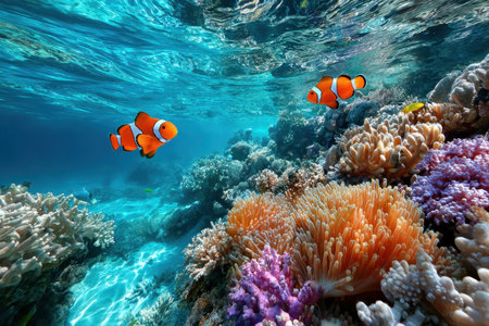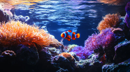 Vibrant clownfish swimming over colorful coral reef under sunlit ocean waters. concept of marine life, aquatic beauty, underwater ecosystem.