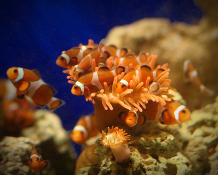 Clown Fish (Amphiprion ocellaris) swimming in sea anemones in aquarium