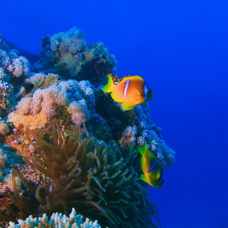 underwater photo coral garden with anemone and a pair of yellow clownfish dad and son