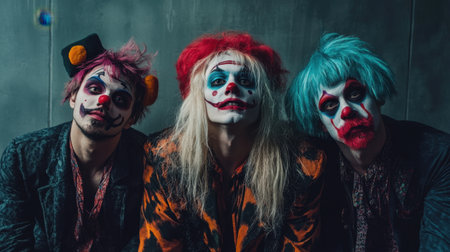 Three colorful clowns with unique makeup and costumes pose together in a dramatic and eerie setting, capturing the essence of playful yet spooky entertainment.