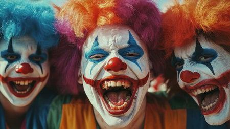 Three colorful clowns express pure joy and excitement, showcasing their vibrant hair and playful makeup in a lively atmosphere, perfect for celebrating fun and creativity.