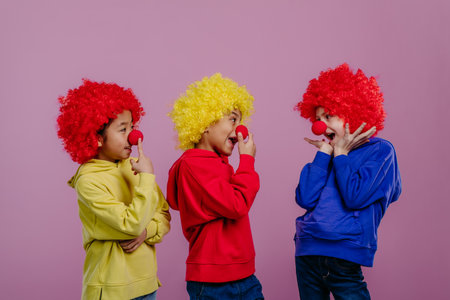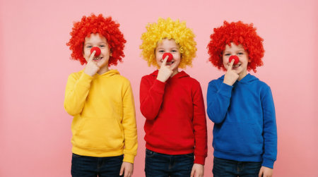 Three young friends, wearing bright yellow, red, and blue hoodies, pose playfully with colorful clown wigs and red noses against a solid pink studio background.