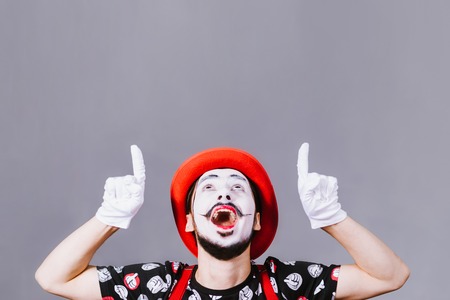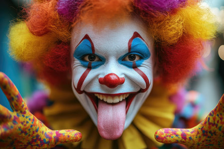Portrait of a scary clown with an evil expression, sticking out his tongue and making hand gestures
