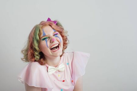 Clown with tongue-out, glasses, rainbow wig and bright makeup. April Fool's Day concept.