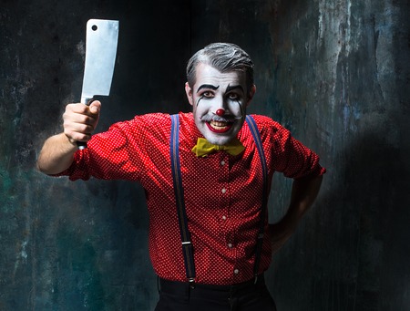 Close-up portrait of a joker man. Stock photo makeup joker in a horror room.