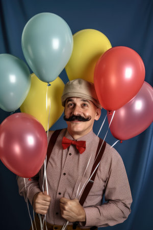 Clown is juggling colorful balls on a blue background, providing entertainment with his skillful performance