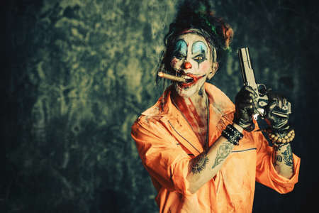 Crazy evil clown man stained in blood is smoking a cigar and holding a gun. Halloween. Horror, thriller film.