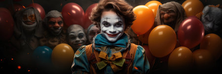 Portrait of a clown with colorful balloons in the background at the carnival