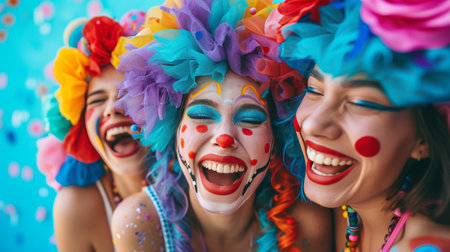 Three colorful clowns express pure joy and excitement, showcasing their vibrant hair and playful makeup in a lively atmosphere, perfect for celebrating fun and creativity.