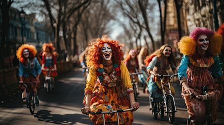 Low angle view of cheerful male and female clowns riding bicycles in a lively city street parade, showcasing vibrant energy and fun.