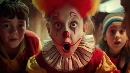 A clown with bulging eyes looks at the children in surprise