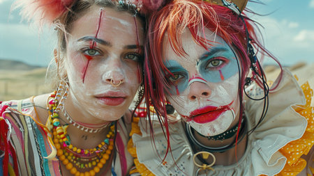 Portrait of two beautiful hippie girls with painted faces in the desert