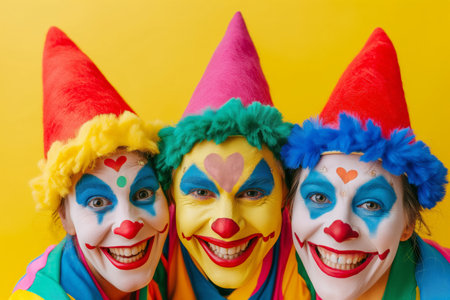Three vibrant clowns with joyful expressions, colorful makeup and costumes, pose against a striking yellow background, radiating festivity