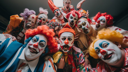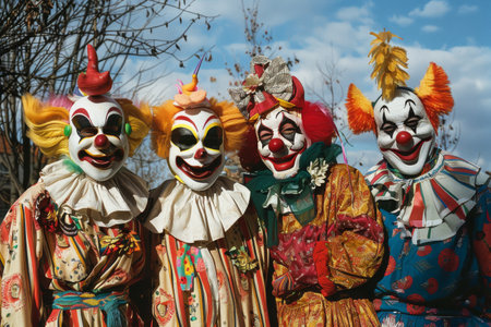 The flamboyant costumes of a group of clowns, AI generated