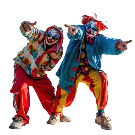 Two clowns wearing colorful costumes are pointing while dancing on white background