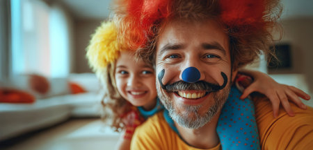 Concept for April 1st. Funny dad with a red clown nose and cheerful daughter. Prank for April Fool's Day. Father's Day.