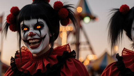 A female clown with black tears. The cinematic horror atmosphere and glowing orange eyes are ideal for Halloween campaigns.