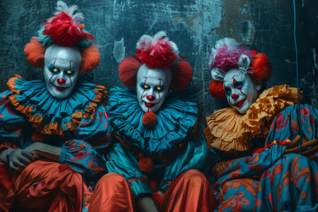 Three colorful clowns with unique makeup and costumes pose together in a dramatic and eerie setting, capturing the essence of playful yet spooky entertainment.