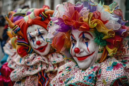 The flamboyant costumes of a group of clowns --ar 3:2 Job ID: a14fa93f-bf3e-4d7a-b28e-f5737a19594d