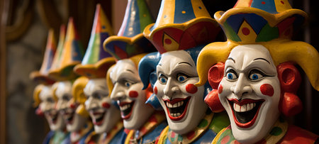 A row of clowns with exaggerated makeup and colorful wigs display a variety of expressions, from joy to malice, in a dramatic display.