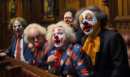 An AI generated illustration of two clowns seated at a table