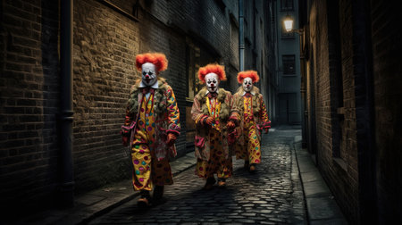 Creepy Clowns Walking Down a Back Alley. Very Dark and creepy looking clowns walking down an old London back alley. AI generated