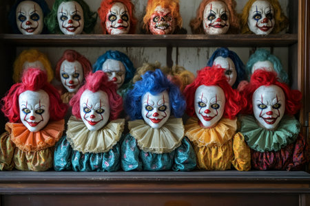 Colorful creepy clown dolls are sitting on a shelf, with more creepy clown heads behind them, creating a disturbing scene