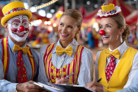 Clowns dressed in bright costumes engage in cheerful conversation while preparing for their act.