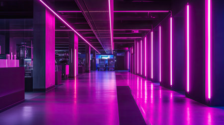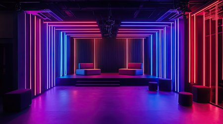 A modern fitness studio featuring stunning neon lighting that creates an energetic and inviting atmosphere, perfect for workouts, dance classes, and group activities.