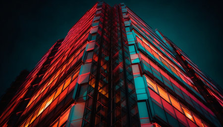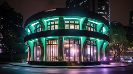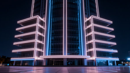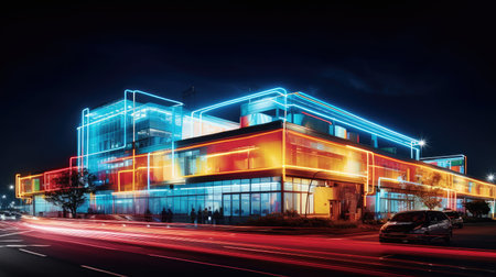 Modern building with neon lights at night