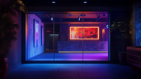 Vibrant neon-lit lobby of a modern art gallery featuring colorful digital displays at night